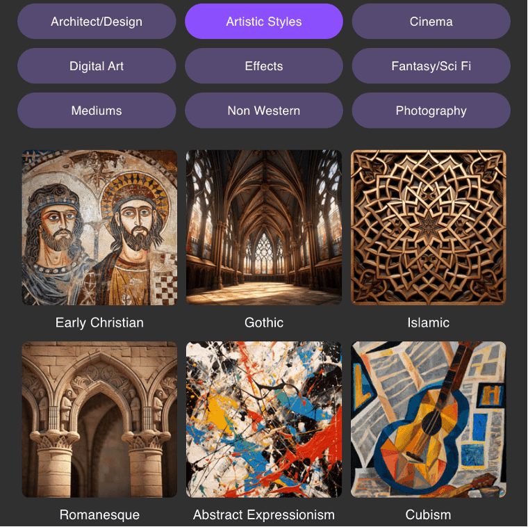 Select styles from common genres such as Architecture, Artistic Styles, Cinema, Digital Art, Effects, Fantasy/Sci-Fi, Mediums, Non Western and Photography. Our previews help you visualize the results